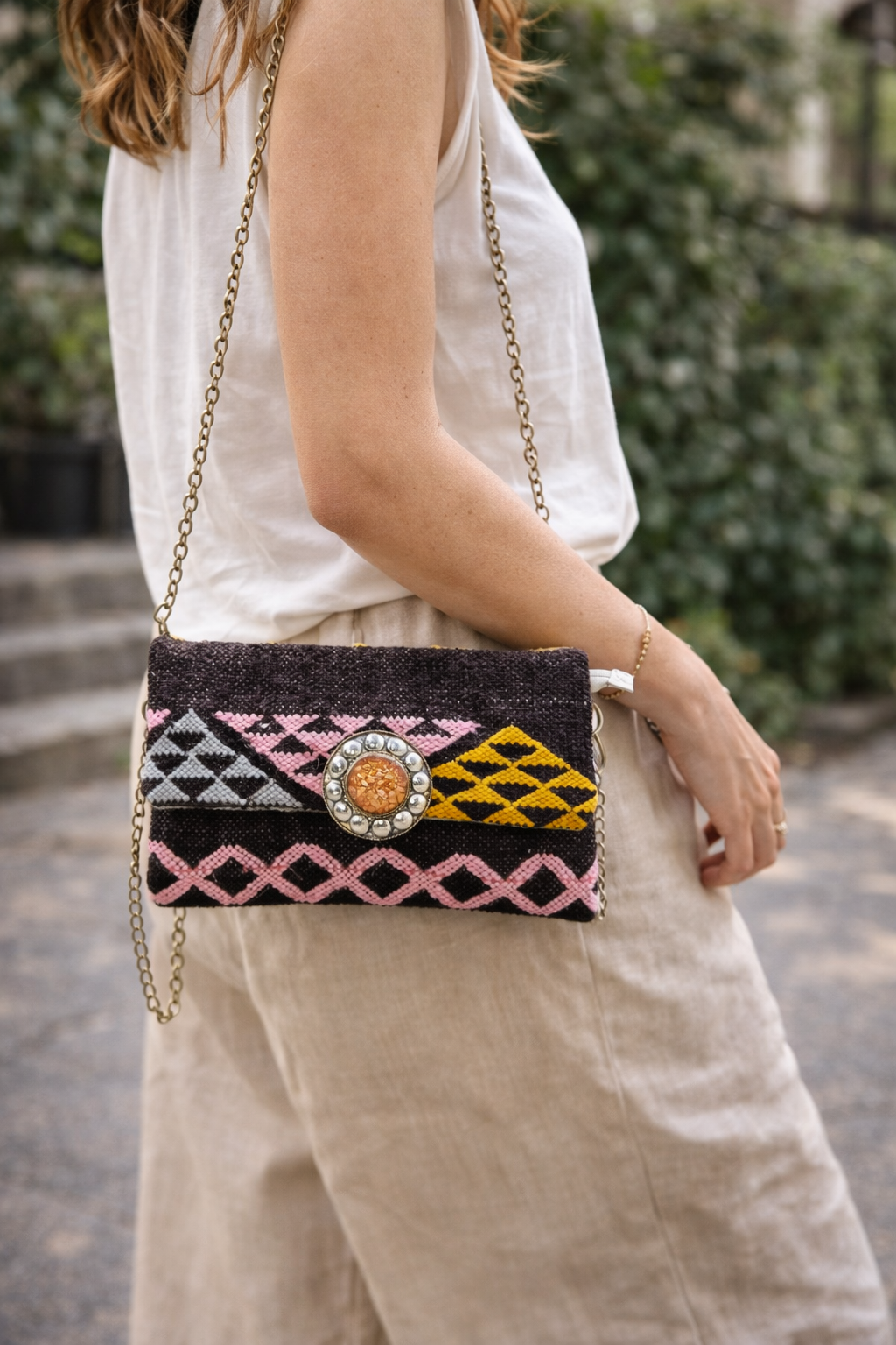 Pochette kilim berbère, issue de l’artisanat marocain, fabriquée entièrement à la main.