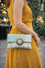 Elle dispose d’une chaînette en métal amovible, d’une fermeture éclair et bouton aimanté.
